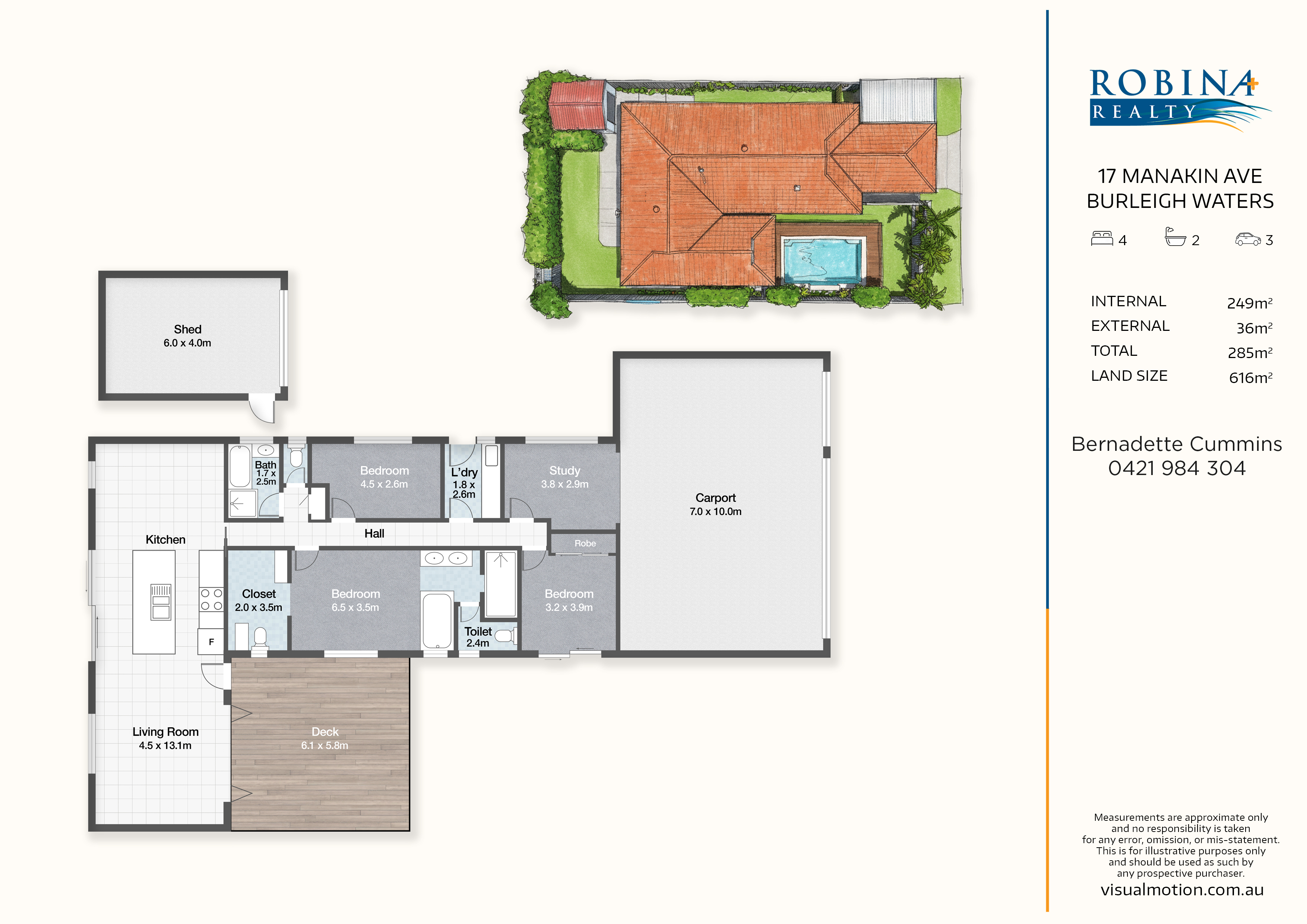 We have in preparing this information used our best endeavours to ensure that the information contained herein is true and accurate. Prospective buyers should make their own enquiries to satisfy themselves as to its accuracy. Although high standards have been used in the preparation of this document, no legal responsibility can be accepted by Robina Realty or any loss or damage resulting from the content or the use of this information. Any photographs show only certain parts of the property as it appeared at the time they were taken. Areas, amounts, measurements, distances and all other numerical information is approximate only.
